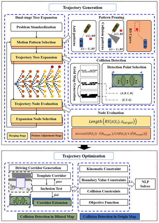 To effectively improve the computational efficiency and planning success rate of the joint spatial–temporal trajectory planning method in narrow parallel parking scenarios, this work analyzes the dual-stage characteristics of the parking process and designs a novel trajectory planning method. The main contributions are outlined as follows: (1) A trajectory generation method called dual-stage motion pattern tree (DS-MPT) is proposed, which significantly improves the computational efficiency and robustness of initial trajectory generation in narrow scenes. (2) A trajectory optimization method is proposed based on an enhanced driving corridor generation strategy, which reduces the time consumption required to construct driving corridors and improves the success rate of trajectory optimization.