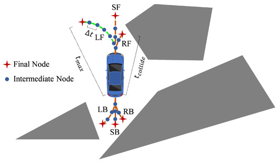 In each decision-making step, the execution time of each can be calculated by . Where is a preset hyperparameter that specifies the maximum expansion time of the motion pattern and refers to the minimum time required to collide with an obstacle when expanding under . It is important to note that this method does not add a node to the trajectory tree after each forward simulation step via . Instead, it only adds the final expanded node within each motion pattern via , as shown in Figure 5. When a node is selected as an expansion node, the intermediate nodes are re-introduced into the trajectory to enhance its time resolution. Unlike the interpolation encrypted method, the intermediate nodes undergo collision detection, providing a stronger safety guarantee. In this article, is set to 1 s, and is set to 0.05 s.