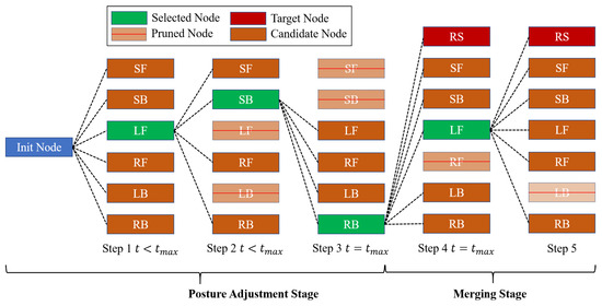 The complete algorithm flow is illustrated in Algorithm 1. The algorithm consists of two stages: lines 1–10 for the posture adjustment stage and lines 11–21 for the merging stage. The trajectory expansion in each stage includes three main functions: optimal node selection (lines 3 and 14), motion pattern pruning (lines 4 and 15), and trajectory tree extension (lines 6 and 17).