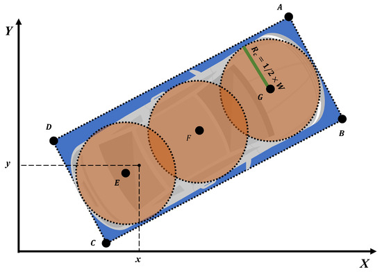 In the parallel parking task, the vehicle envelope’s corner points are prone to collisions. Using an approximate representation that ignores the corner points (e.g., inscribed circles) reduces computational complexity but simultaneously compromises the quality of the solution. Considering calculation efficiency and detection accuracy, this paper combines two envelope forms, namely disk approximations and an oriented bounding box (OBB), to simplify the representation of the vehicle shape. we sampled the four corner points of the OBB and the three disk center points. As shown in Figure 7, A, B, C, and D perform collision detection in the original obstacle grid map, and E, F, and G perform collision detection in the dilated grid map. represents the radius of the inscribed circles. The coordinate calculation formula for each detection points is expressed as follows: