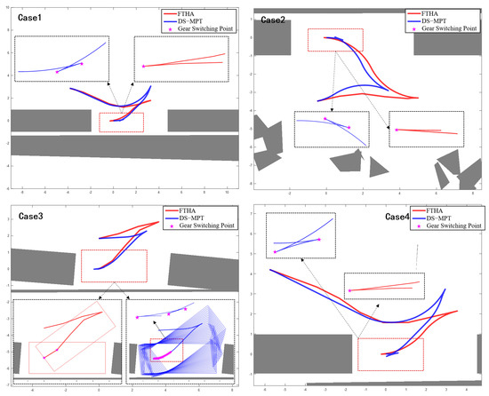 In this section, this paper selects CPU time (), the number of solution iterations (), trajectory length (), the number of switching maneuvers (), and point density () as evaluation metrics. We selected Fault-tolerant Hybrid A* (FTHA) for comparison, which was proposed in [27] and enhances the completeness of the Hybrid A* method. Another comparison method is based on a spatial–temporal decomposition strategy (STD) [45]. STD uses the two-stage characteristics of parallel parking like DS-MPT. The difference is that STD is solved based on the optimization method, while DS-MPT is based on the sampling and searching method. STD relies on structured scene descriptions and is not applicable to unstructured scenes in TPCAP cases. Therefore, in Case 1 to Case 6, we only compare the FTHA method with the DS-MPT method. In Case 7 to Case 16, we uniformly compare the performance of the three methods.