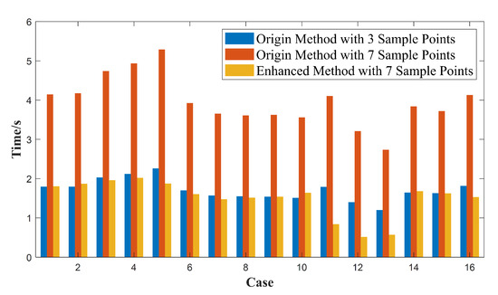 We measure the computational efficiency of the two driving corridor generation strategies. The origin corridor generation method is cited from [48]. The experiment assesses the utilization of the original method for generating driving corridors with three inner-circle center points, as well as the utilization of both the original strategy and the enhanced strategy for generating driving corridors with seven envelope sampling points. The experimental results are shown in Figure 10. When generating corridors for seven sampling points, the enhanced strategy can significantly reduce the calculation time by 54–84% compared to the original strategy. Importantly, the calculation time is lower than or comparable to that of the original method, which calculates the driving corridor using three inner-circle center points.
