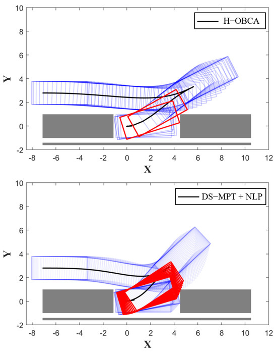 In terms of trajectory quality indicators, both the STD method and our method exhibit excellent performance in terms of . Our method produces the shortest trajectory in four scenarios, while the STD method outperforms in the remaining six scenarios. For the indicator, there are significant differences among the four methods. The reason is that all the methods used in the experiments transform the continuous-time trajectory planning problem into a finite, nonlinear program with constraints applied at finite collocation points. However, potential violations between adjacent collocation points can occur. Because of this, some trajectories find exactly two feasible collocation points that cross the obstacle. In this situation, although the trajectory has a lower value, it is actually not feasible. To be honest, our method does not solve this problem. However, since the initial speed profile considers the two-stage characteristics, more points in the initial trajectory are concentrated near the parking area. The optimal obtained trajectory is relatively better in terms of safety. Figure 11 shows the trajectories obtained by H-OBCA and our method under Case 12.