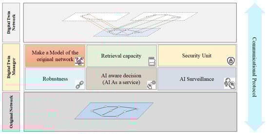 The new generation of connectivity is achieved through an innovative approach that enables users to experience seamless connectivity, mirroring the original network experience. This method provides the same feeling for any connection within the original network. To achieve synchronicity between the original network and its replica, this approach requires a suitable protocol, along with other essential components, including network capacity, computational requirements, and network services. A virtual network twin (VNT) is introduced as a virtualized replica of the original network, emulating its behavior while maintaining synchronization with the real network. A major challenge arises from this virtualization process, particularly the synchronization between the network twin and the original. To address this issue, a digital twin manager was proposed. This unit plays a critical role in the VNT with several functionalities such as security and robustness. Figure 2 illustrates our proposed framework, referred to as virtual network twin, which can be divided into several sections: the original network, the digital twin network (DTN), the digital twin manager, and the communication protocol.
