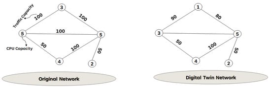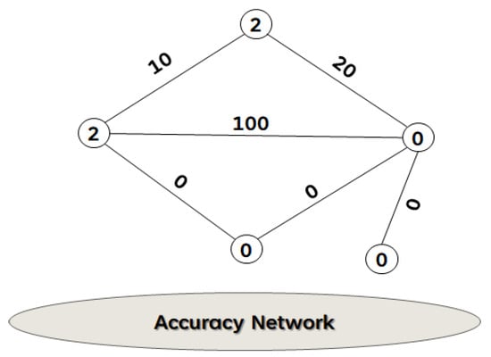This formula represents the absolute average differences between the performance values of the physical network and those of its digital twin. The simple numerical example is prepared and presented below to clarify this metric. The network comprises five nodes and six edges, as illustrated in Figure 4.Figure 4. Numerical example: a small-scale network with five nodes.According to Figure 4, the simple DTN depicted is not exactly the same as the original network in terms of CPU capacity and throughput; however, their behavior is almost identical. The accuracy metric measures the differences between these two layers. In the first step, the Accuracy Network is defined based on the differences between these two layers, as shown in Figure 4. The accuracy network is represented in Figure 5.Figure 5. Numerical example: the accuracy network.Then, the normalized differences for two parameters including CPU capacity (C) and throughput (T) are calculated.The accuracy of the DTN based on the normalized differences and weight factors for two parameters is 1.21. - Retrieval Capacity: This indicator refers to the efficiency of the retrieval system and data processing. To measure this, the total time taken to respond to requests, known as the response time (RT), is considered. This encompasses the time required for processing a request, communication between the digital twin network and the physical network, and the response to the user. The response time in retrieval capacity includes the following: