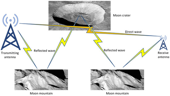 We investigate the H-ITM lunar radio wave propagation fading model, analyzing the path loss of radio wave propagation [14]. It analyzes the typical radio wave propagation path loss prediction model, ITM, and studies the process of predicting path loss in H-ITM lunar radio wave propagation [15]. The different communication environments on the lunar surface are divided into free space segment, dual-path loss propagation segment [16], and spherical diffraction propagation segment, as shown in Figure 1.