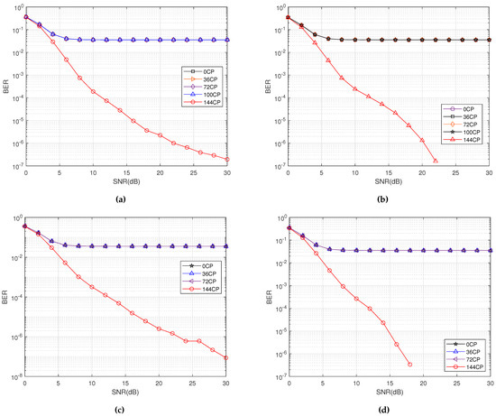 We simulated and calculated the BER performance under different CP lengths and plotted the curves for comparison. In the TDD, we set CP lengths to 0, 36, 72, 100, and 144. The cumulative time is greater than 140 CP, so we observe that when CP equals 144, the BER performance steadily improves with increasing Signal-to-Noise Ratio (SNR). When the cumulative CP time is less than the delay, BER performance remains unchanged.