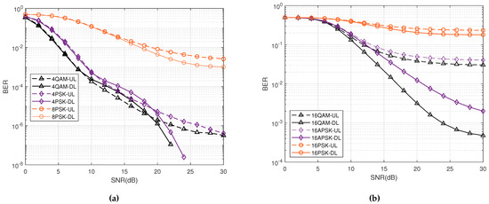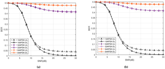 It is worth noting that the simulation results clearly indicate that, across all modulation schemes, the BER performance for downlink transmission is superior to that for uplink transmission. Among the same-order modulation schemes, QAM modulation exhibits the most superior BER performance. Between APSK and PSK, the performance of APSK is significantly better than that of PSK. Therefore, in the design of the transmission system, we opt for the 4QAM modulation scheme, which demonstrates the optimal performance.