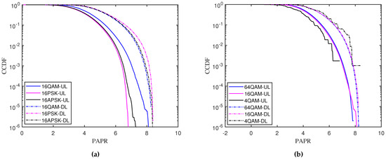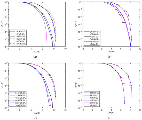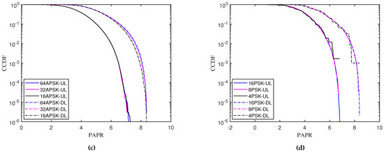 In both TDD and FDD modes, we conducted a comprehensive comparison of phase shift keying (PSK), amplitude phase shift keying (APSK), and quadrature amplitude modulation (QAM) modulation schemes across various orders in both the uplink and downlink scenarios. In the TDD, The performance comparison is shown in Figure 4a–d. In the FDD, The performance comparison is shown in Figure 5a–d. CCDF stands for Complementary Cumulative Distribution Function. Specifically, for APSK modulation, we examined orders 4, 5, and 6, for PSK orders 2, 3, and 4, and for QAM orders 2, 4, and 6. Additionally, we scrutinized the PAPR for different modulation schemes at order 4. In the downlink, communication utilizes OFDMA, whereas the uplink employs SC-FDMA. The impact of modulation order on PAPR remains consistent across the same modulation scheme. At modulation order 4, SC-FDMA exhibits the optimal PAPR performance under PSK modulation. For the OFDMA, the optimal PAPR performance is achieved with QAM modulation.