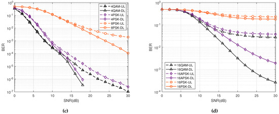 The impact of different modulation schemes on BER performance is shown in Figure 6a–d. Based on the simulated results of CP lengths obtained earlier, we chose 144 CP for TDD and 72 CP for FDD as the system parameters for modulation scheme simulation. We conducted a detailed comparative analysis of the BER performance for QAM, APSK, and PSK with the same order of modulation in both uplink and downlink transmissions. In this process, OFDMA was used for uplink communication, while SC-FDMA was employed for downlink communication.