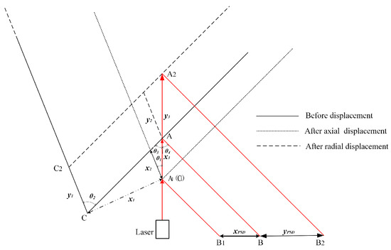 The dashed line 2 represents the position after radial displacement, where the laser strikes point D on the main shaft surface, is reflected by the mirror, and lands at point B2 on the PSD surface. The displacement between points C and C2, denoted as , represents the radial displacement of the main shaft, while the displacement between points B and B2, denoted as , represents the displacement of the light spot on the PSD surface.