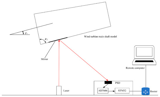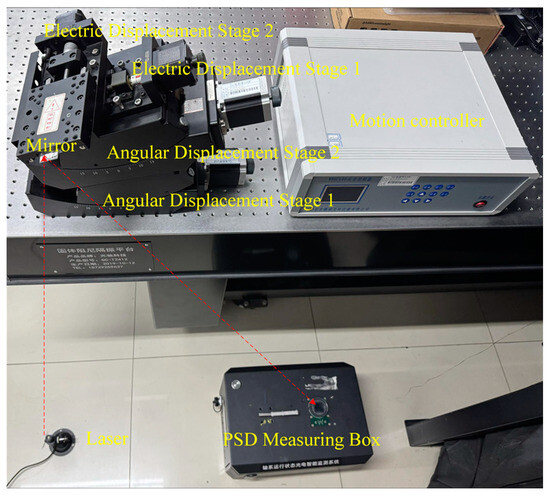 The overall structure of the PSD-based main shaft displacement monitoring platform designed in this paper is shown in Figure 9. The structure consists of a simulated wind turbine main shaft model, a laser, a mirror, a PSD measuring box, and a motion controller (WNSC6000). The PSD, STM32, and AD7606 are all integrated within the measurement box, and the collected displacement data of the main shaft are displayed on a remote computer. The motion controller WNSC6000 controls the electric displacement stages to move in specified directions and displacement values. The experimental model simulating the wind turbine main shaft consists of two angular displacement stages and two electric displacement stages.