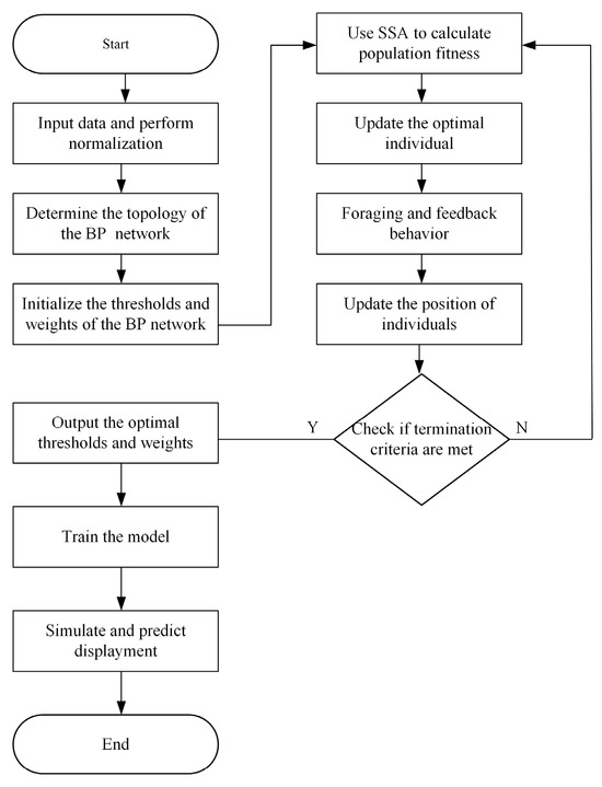 This process is repeated, executing the SSA search process until a stopping criterion is met (such as the maximum number of iterations or achieving a certain fitness threshold). After several iterations, the SSA outputs the optimal weights and thresholds, and the corresponding BP neural network becomes the optimal model. The flowchart for SSA-BP neural network-based main shaft displacement prediction is shown in Figure 7.