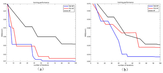 Next, training was conducted for the radial displacement. As shown in Figure 8b, the conventional BP neural network required approximately 78 iterations to reach a minimum of 0.0212 mm2. The PSO-BP neural network required about 70 iterations to achieve an of 0.0195 mm2, whereas the SSA-BP neural network achieved a minimum of 0.0086 mm2 in around 53 iterations.