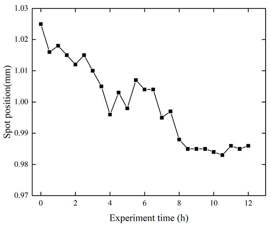 To evaluate the system’s stability, the experimental model was kept stationary, and measurements were taken from the moment the system was started. Data were recorded every 30 min for a continuous 12 h period. As shown in Figure 10, during the initial phase of operation, measurement errors were relatively large due to the instability of the laser intensity and uneven light spots. However, once the laser intensity stabilized, the measurement data remained relatively consistent. The fluctuation range of the light spot was approximately ±0.024 mm, which meets the system’s accuracy requirements.