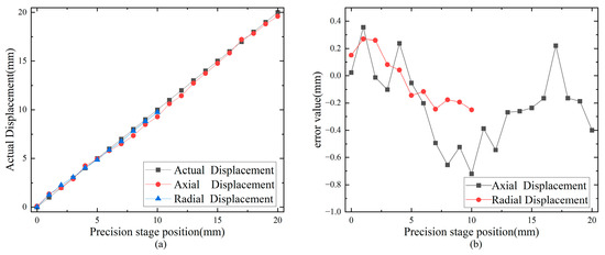 Figure 11 presents the measurement results of the main shaft displacement without model correction. Figure 11a shows the displacement position comparison data, where the maximum absolute error for axial displacement is 0.72 mm, with a mean squared error () of 0.0787 mm2. For radial displacement, the maximum absolute error is 0.251 mm, and the is 0.0249 mm2. Figure 11b illustrates the position error distribution across the measurement points. Calculations show that the maximum nonlinearity error rate for the axial displacement measurement system, with a total range of 20 mm, is 3.6%, while the radial displacement measurement system, with a total range of 10 mm, exhibits a maximum nonlinearity error rate of 2.5%. These results indicate that the system error is relatively large without model correction, making it insufficient for high-precision measurement requirements, and highlighting the necessity of error correction.