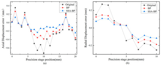 To verify the feasibility of the SSA-BP algorithm for error correction, the main shaft model was kept stationary while motorized displacement stages 1 and 2 were controlled to move in 1 mm increments. As indicated by the statistical analysis of measured data discussed earlier, most axial displacement data during normal operation falls within the ±10 mm range, while radial displacement data are typically within the ±5 mm range. To simulate extreme conditions that exceed these normal ranges, an axial displacement of 20 mm and radial displacement of 10 mm were simulated, and the main shaft displacement was measured using three approaches: without a neural network model, with the BP neural network model, and with the SSA-BP neural network model trained earlier.