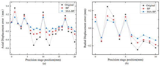 The results clearly demonstrate that the SSA-BP neural network outperforms both the BP neural network and the uncorrected state. The maximum nonlinearity errors for both axial and radial displacements after SSA-BP correction are below 2%, significantly improving the system’s linearity and ensuring the measurement results are closer to the ideal linear model. Additionally, the substantial reduction in after SSA-BP correction indicates improved anti-interference capabilities and enhanced stability of the system. Furthermore, the SSA-BP algorithm exhibits stronger error correction and prediction performance in complex measurement environments, effectively enhancing the system’s accuracy and reliability.
