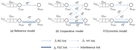 We consider a network with two transmitter–receiver pairs, as depicted in Figure 1. One pair (the upper pair in the figure) is communicating only through an RF channel(s) (). The other uses hybrid FSO and RF channels (). We investigate three different operating scenarios of the network according to the level of cooperation between and pairs: a non-cooperative reference model (Figure 1a, referred to as REF in this paper), a cooperative model (Figure 1b, referred to as COG in this paper), and an economic cooperative model (Figure 1c, referred to as ECO in this paper). In the non-cooperative model that is used as a reference, both and have their own RF frequency (denoted by and , respectively) and , in addition, has an optical channel . and send packets independently. uses RF channel as a backup of the optical channel (referred to as stay-and-switching (SAS) in this paper). In SAS, uses only when the quality of drops below a certain level. However, we also investigate simultaneous multipacket transmission (SMT) in which HY tries to transmit packets simultaneously through both and to enhance the throughput compared to SAS.
