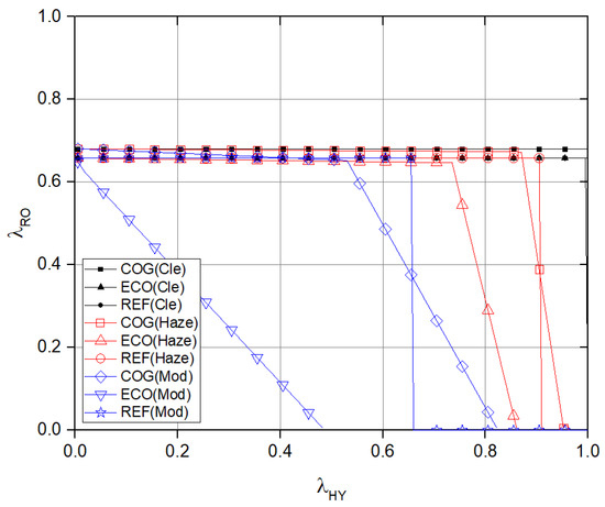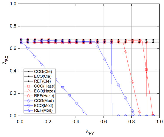 Figure 6 illustrates the stability regions for the SMP with . Under clear air conditions, the stability region of the cooperative and economic system decreases as increases. In the SMP, the hybrid FSO/RF pair within the cooperative and economic system seeks to access the frequency for additional transmissions, even when the HY successfully sends packets through the FSO link. As a result, the stability region of the cooperative and economic system diminishes with increasing in clear air conditions. In the cooperative system, the RF pair can maintain stability with as long as . When , the RF pair experiences less interference from the hybrid FSO/RF pair and has a greater chance of accessing the idle channel at . Consequently, the average number of service packets for the RF pair exceeds 1. Similar trends are observed under haze and moderate rain conditions.