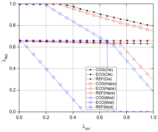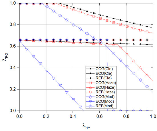 When , there is a reduced chance of interference from the RF pair on the hybrid FSO/RF pair, leading to a greater opportunity to access the idle channel of . This results in a higher compared to REF. However, within the range of , the likelihood of interference with the hybrid FSO/RF pair increases, diminishing the opportunity to access the idle channel of , which leads to a lower than REF. Once , the hybrid FSO/RF pair in the REF case fails to reach a stable region. In contrast, the cooperative case enables the hybrid FSO/RF pair to achieve a stable region by accessing the frequency. Under moderate rain conditions, the results indicate a lower . The economic system presents an equal (in clear conditions) or smaller stable region than the REF across clear, haze, and moderate rain conditions.