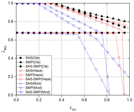 Figure 8 illustrates the stability regions for the cooperative system with m. The SAS-SMP represents the hybrid variation of the cooperative system discussed in (58). In the SAS-SMP configuration, the node operates under the SAS, while operates under the SMP. Consequently, in clear conditions () and in haze conditions (), the likelihood of transmitting packets through FSO channels, rather than using wireless channels, increases. This, in turn, enhances the probability of successful packet transmission via wireless channels by . However, since does not operate in SMP, the likelihood that is empty decreases. This increase raises the probability of interference between and within the SMP scenario. Thus, the relationship between can be summarized as follows: SAS < SAS-SMP < SMP. In a moderate rain scenario, the probability of packet transmission through the FSO link drops to zero. Additionally, the probability that in SAS-SMP generates an interference signal on channel is lower than that of in SMP. For this reason, the interval where exhibits a higher compared to SMP.