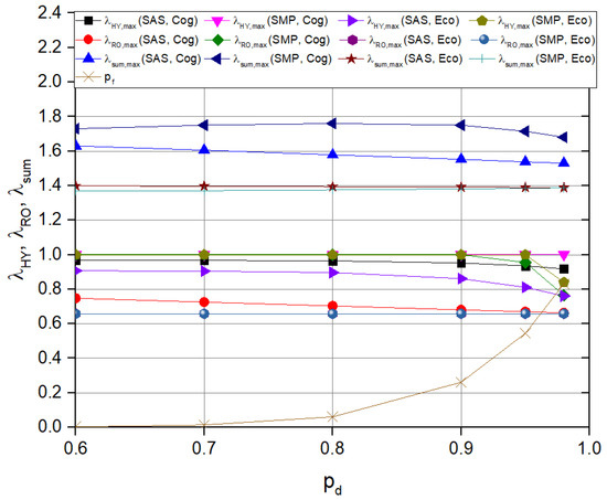 A similar trend is observed for the maximum in the cooperative system with SMP; however, remains constant at 1. The maximum value of in the cooperative system with SAS decreases as the detection probability increases. In contrast, the maximum for the cooperative system with SMP initially increases and then decreases with a rising detection probability. Compared to SMP, SAS is less likely to interfere with other pairs. Consequently, the advantages of reducing interference from other pairs are outweighed by the disadvantages of decreasing transmission opportunities as detection probability increases. In the economic system, the maximum value of remains unchanged as detection probability increases, since the RF pair cannot borrow the frequency. However, the maximum values of and decrease with increasing detection probability, as this reduces the chance for hybrid FSO/RF pairs to access the frequency.