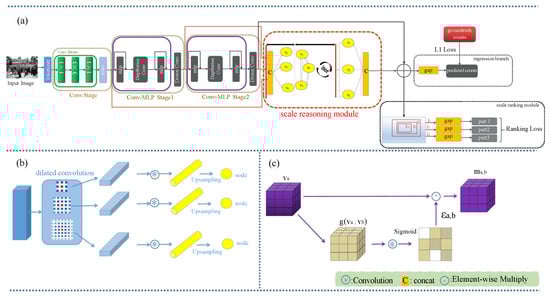 SR2 consists of the MLP encoder, scale-reasoning module, scale-ranking module, and the regression branch, as illustrated in Figure 1. Specifically, given an imported image, it is firstly fed into the MLP encoder, which has a tokenizer, which can extract the initial features, the convolution stage, which improves the connectivity of the space, and two MLP stages for extracting global features . Then, the features are fed into the scale-reasoning module. The scale-reasoning module adopts the different dilated rates to capture the multiscale information. Furthermore, the scale-reasoning module has a graph neural network that contains nodes and edges, where the nodes stand for the pixels in the image and the edges represent the tightness of the relationship between the nodes. Thus, the scale-reasoning module can fuse the region-to-region dependency in the images. Then, the fused feature maps are sent to the regression branch and scale-ranking module, respectively.