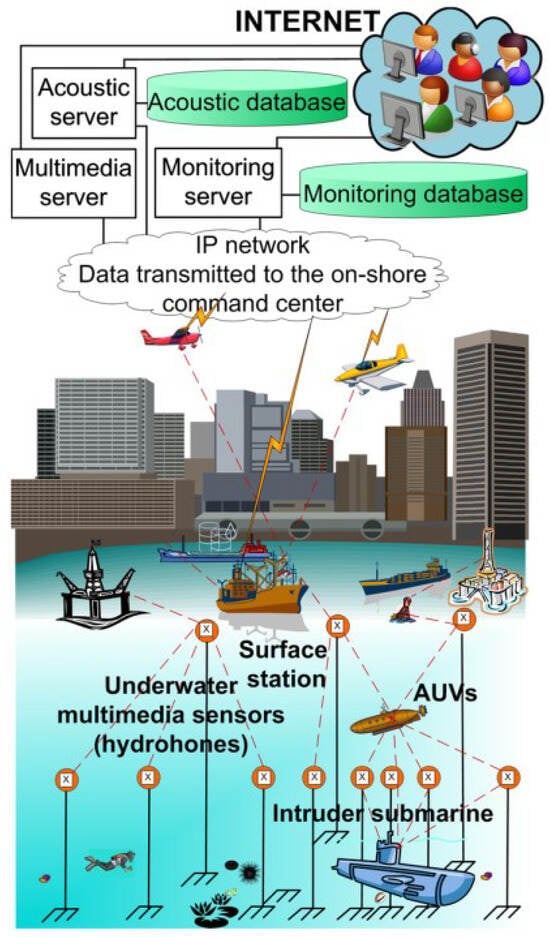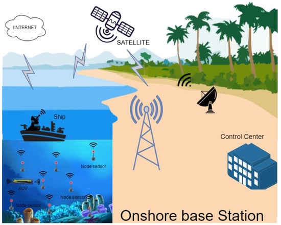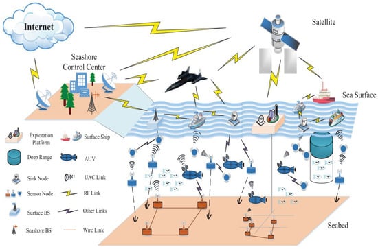 The model of the underwater network is shown in Figure 3. Kao et al. [], in their review, discussed underwater networks as follows: