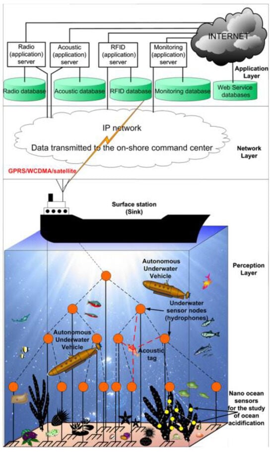 - Perception Layer: This layer serves to recognize objects and collect data, primarily comprising underwater sensors; underwater vehicles; surface stations (receiving devices); monitoring stations (such as tablet PCs and smartphones); data storage tags; acoustic, radio, and PIT tags; and hydrophones/receivers/tag readers.