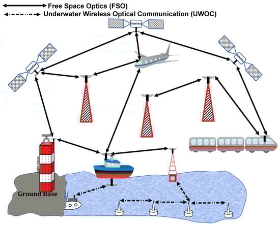 Recently, there has been a growing presence of interconnected physical objects, giving rise to the Internet of Things (IoT) concept. The IoT has significantly transformed various aspects of our lives, including healthcare, energy management, industrial processes, agriculture, livestock, infrastructure, and technology. This interconnected network of devices has the potential to link objects across the globe, enhancing our ability to interact with our surrounding environment for a more enriched living experience []. The IoT has primarily focused on and undergone extensive research in terrestrial and urban network environments. This substantial groundwork has laid a robust foundation for the rapid growth of industrial IoT, which is progressing remarkably as of the present moment []. Nonetheless, 72% of the Earth’s total surface area, which spans 509 million square kilometers, is occupied by water. Scientists grew interested in underwater exploration, which has driven technological advancements toward creating a “smart ocean” or the Internet of Underwater Things (IoUT). This concept extends the IoT designed explicitly for underwater environments.