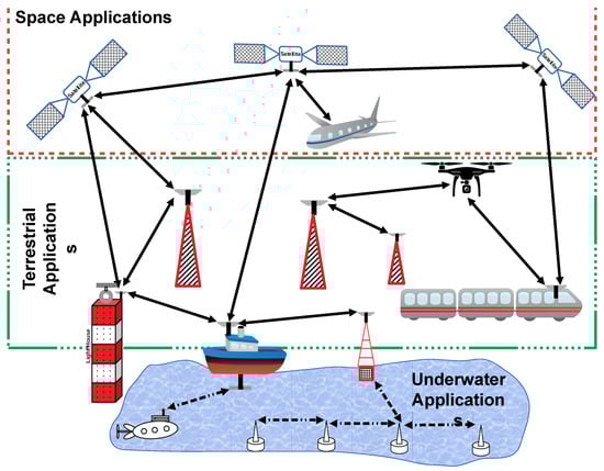 Conversely, the assessment of routing protocol performance in underwater communication systems entails an extensive survey, with each underwater network presenting its distinct advantages and challenges. Practical underwater applications based on UWSNs are examined in []. The trade-off between underwater properties, wireless communication technologies, and communication technology is thoroughly explored in []. Practical applications in ocean and marine IoT, UOWN, and UWANs are discussed in [,,,,,], respectively. Wei et al. [] provide a survey on wireless channel measurements and modeling perspective for maritime communications. Pons et al. [] discussed the significance of tackling interference issues and optimizing network performance within 5G networks. Such efforts are crucial for ensuring dependable and efficient connectivity for IoT devices, a necessity for the smooth operation of business processes.