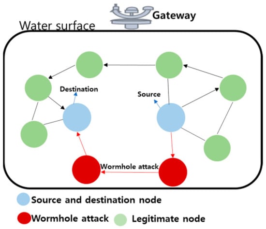 Underwater sensors and AUVs work together to thoroughly examine underwater marine infrastructure and to monitor and identify oil spills in pipeline systems. These sensors can be positioned both within and outside the pipelines. In IoUT, the majority of communications rely on acoustic connections. While acoustic waves have gained broad acceptance for underwater communication within the scientific community as a physical transmission, the extensive propagation delays associated with acoustic waves and the elevated bit error rates in the underwater acoustic channel create obstacles to effective communication. The distinctive attributes of the underwater acoustic communication channel, as discussed by Domingo et al. [], necessitate creating security measures that are both effective and dependable for the IoUT. Safeguarded against denial-of-service (DoS) attacks secures the communication between sensors and AUVs. These attacks can disrupt the IoUT’s regular operation and timeliness.