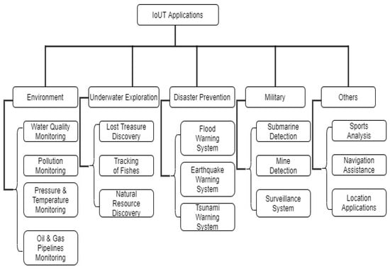 Environmental monitoring stands out as a widely utilized category of IoUT applications. This encompasses various aspects such as monitoring water quality [], tracking chemical and biological pollution [], overseeing thermal and pressure levels, and monitoring temperature variations []. Moreover, the application scope extends to monitoring oil and gas pipelines through UWSNs []. It is worth noting that the demand for environmental monitoring systems has risen significantly, gaining popularity and becoming an essential component in the development of smart cities worldwide [].