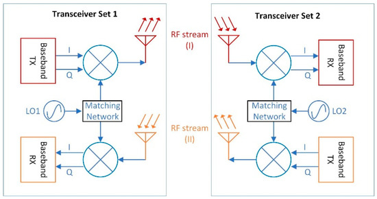 Figure 1 shows the simplified diagram of the proposed system with two transceiver sets. In the HD mode, one transceiver is configured as the transmitter and the other as the receiver. Since they are always working in opposite modes, there is only one RF stream available all the time, which is also named time division duplexing (TDD). While in the frequency division duplex (FDD) mode or the in-band full-duplex (FD) mode, both transceiver sets act as transmitters and receivers simultaneously. Two RF streams are available in the opposite direction, and they can be configured with either the same or different carrier frequencies. In FDD, different carrier frequencies are used, while in FD, the same carrier frequency is used. Figure 2a,b shows the spectrum conversion for both the FDD and FD modes.