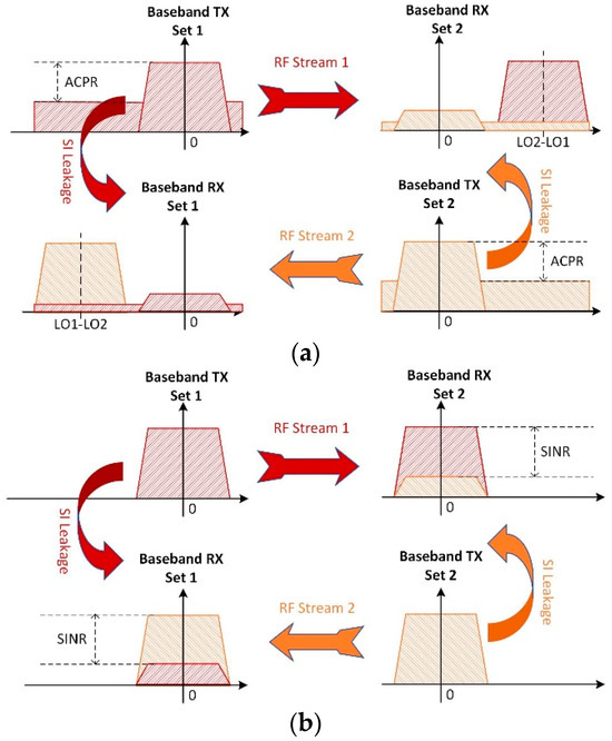 In the FDD operation mode shown in Figure 2a, the LO frequencies are set at LO1 and LO2 so that the transmitter and receiver are separated in the frequency domain. This is achieved by adopting wide-bandwidth amplifiers in the receiver chain to cover its adjacent band. The wanted signals are separated from the SI signal in the frequency domain, and they can be recovered using a high-pass filter. The adjacent channel power ratio (ACPR) and SI isolation are the dominant considerations for FDD operation. However, the channel utilization is low, as both transceivers occupy separate physical channels. The digital baseband processor needs to handle the signal with an IF carrier, which will increase the complexity of the data processing units. In the FD mode, as shown in Figure 2b, both transceivers work simultaneously using the same channel, such that two RF streams share the same physical channel but are in opposite directions. In this mode, a frequency reuse strategy can theoretically double the spectral efficiency. The technical difficulties for such an approach are the requirement for SI suppression or cancellation, as the SI and the wanted signal overlap at the baseband. An excessive SI may even result in a reduced capacity for the FD system that falls below the HD systems. As shown in Figure 2b, the signal-to-interference and noise ratio (SINR) is the key parameter to estimate the capability of the FD system. In principle, the SI can be perfectly regenerated and compensated since the transmitted data are known inside the transceiver. However, the realistic SI is also affected by the non-linear effects of the transmitter and receiver chain and the unpredictable LO phase noise that makes it far from the estimation.