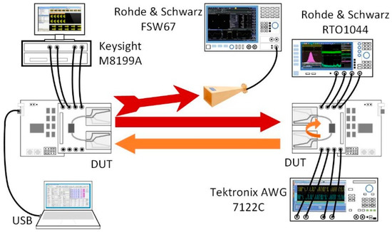Figure 7 shows the measurement setup of the transceiver system. One set of DUTs is configured as the transmitter. A Keysight M8199 arbitrary waveform generator (AWG) with corresponding software features (81199A) is used to generate a baseband test pattern. A horn antenna is connected to the Rohde and Schwarz FSW67 spectrum analyzer to check the transmitter power. The single-tone baseband signal is used to measure the maximum output power of the PA and channel flatness over the specified frequency band. The power plot is calculated based on the measured power, amending with the estimated setup losses.