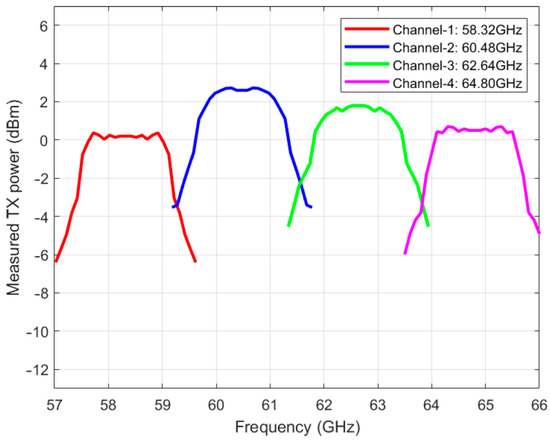 The transmitter power is measured by using a single-tone quadrature signal, varying frequencies from 100 MHz to 1.3 GHz, with a 100 MHz frequency step. The measured power is plotted based on four-channel modulation and mirrors for the same frequency offset, as shown in Figure 8. The measurement is taken at a 1 m distance with an additional 3 dB amplifier GPA between the receiver horn antenna and the FSW67 spectrum analyzer. An additional 60 GHz amplifier is added, as the received signal power is too low for FSW67 to demodulate. Based on the setup and considering the free-space link loss Gpl to be 68 dB, the gain of the onboard transmitter antenna Gtx and horn antenna Grx are 12 dBi and 17 dBi, respectively. Also, the total loss for the 60 GHz cables and adaptors Gcable is 8.7 dB. The transceiver output power is 16.7 dB higher than the directly measured value, as estimated in (4). Figure 8 plots the transmission power of the transceiver chip based on measurement results.