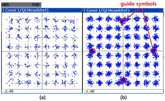 A constellation diagram in the FD measurement for the (a) QPSK MCS9 data symbols and (b) the QAM16 MCS12 data symbols.
