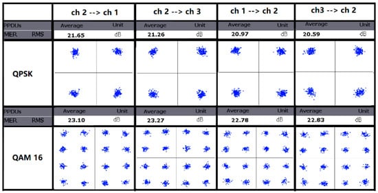 The dominant SI signal in the system comes from the 60 GHz domain before the LNA input. To measure the isolation between the transmitter and the receiver chain, the gain of the receiver’s IFA is set to a minimum, and the DVGA gain is set to 5 dB. The output data from the DSIC are demodulated by a Keysight 89,600 VSA as shown in Figure 14. The reported EVM values for QPSK and 16-QAM are −17.05 dB and −17.8 dB, respectively. Here, the 16-QAM-based EVM is worse than the actual value, as 1/8 of the symbols are piloted and modulated by π/2-BPSK. It is not mapping correctly. Assuming all the pilot symbols have a similar vector error as the data symbols, the amended EVM for all symbols should be −18.7 dB in 16-QAM. As the VSA software cannot decode the original package before the DSIC, we assume the EVM is the same as the received SINR, which is 12 dB, as shown in Figure 12. Hence, the MATLAB-based DSIC in this measurement achieved a 6.7 dB EVM improvement.