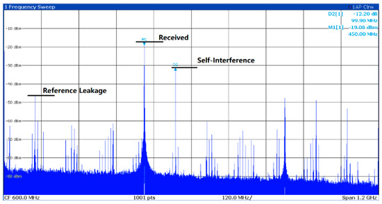 Figure 12 shows the single-tone signal’s power spectrum received together with the local SI at 0.8 m. The measured transmission power is −3 dBm. The 450 MHz is the received signal from the antenna, and the 550 MHz is the SI from the local transmitter. Here, both transmitters are configured at the same condition with similar PA output power, and both the transmitter and receiver are operated on channel 2. The transmission loss here is 42 dB as calculated in (4), where the antenna gains for the transmitter Gtx and receiver Grx are all 12 dBi.