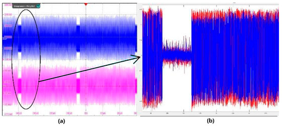 For the modulated signal measurement, the RF isolation is around 30 dB, as a 5 dB gain is set at the receiver’s DVGA to attain enough baseband signal amplitude. Figure 13 shows the time domain signal before and after DSIC processing. Two frame packages available with a 2 µs gap between them are captured in Figure 13a. The SI signal is available all the time, and it can be observed easily during the 2 µs package gap. The I and Q signals are captured by the oscilloscope in channels 1 and 2, as shown in Figure 13a. Figure 13b plots the received package data after the DSIC module. Here, the Rohde and Schwarz RTO 1044 oscilloscope captured data at 10 GSym/s, with 8 bits of valuable ADC output. The symbol rate of the test sequence is 1 GSym/s for both transmitters. The captured data are resampled at 4 GHz, and the out-band noise is removed before sending them to the DSIC.