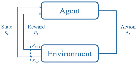 Reinforcement learning (RL) focuses on improving an autonomous agent’s behavior in accomplishing assigned tasks through interactions with the environment, resembling human or biological learning patterns. The functioning of reinforcement learning is illustrated in Figure 1, where the agent observes each step (t) and obtains the environment’s state (St ∈ S). Based on the input state, the agent selects discrete or continuous actions (At ∈ A) as the output. After executing the action and interacting with the environment, the agent acquires a new state (St+1) and receives a reward (Rt+1 ∈ R).