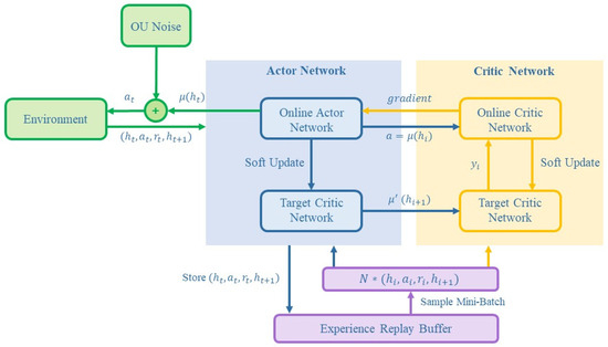 To further enhance the stability and convergence speed of the algorithm, DDPG employs the Experience Replay mechanism. This technique involves storing a collection of past experiences and then randomly sampling from this collection during training. By learning from a diverse set of experiences, the algorithm can improve its robustness and overall performance. Furthermore, OU Noise (Ornstein–Uhlenbeck Process) is typically combined with DDPG to aid in learning deterministic policies [32]. During the training phase, OU Noise is incorporated into the actions to enhance the agent’s exploration rate. Particularly, OU Noise assists the agent in exploring temporal correlations between neighboring actions, thereby enhancing the exploration intensity in the selected direction.