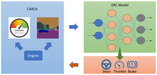 In this section, we begin to clearly explain how we devised and trained our two DRL models for controlling a self-driving car to perform the behavior of crossing an unsignalized intersection, including turning right, going straight and especially turning left. In particular, both our models are constructed mainly based on the existing Convolutional Neural Network (CNN) architecture. Although CNN architecture is well known in building models for extracting critical features from an image to facilitate decision making, we still need to decide how many convolution layers and pooling layers should be used for our application. On the one hand, the two DDPG and RDPG learning algorithm proposed in the literature are exploited for training our DRL models. However, we have to carefully design the reward mechanism for these two algorithms to train the models to be faster and more accurate. Note that the above two issues both must be manipulated by building a proper experimental learning environment and carrying out a long process of trial and error. This is our work’s main contribution. Here, the block diagram shown in Figure 7 is exploited to illustrate the relationship between CARLA and our driving-control DRL models. Thanks to the architecture of such a simulation tool, for the different DRL learning algorithms, such as DDPG and RDPG, we just need to replace the source code in the DRL model with another one. Furthermore, CARLA can generate realistic sensed data and send them directly to the DRL model for the training procedure. After the training has finished, upon receipt of the required sensed data, the DRL model can continuously provide decision actions to CARLA for the purposes of emulating the process of crossing an unsignalized intersection autonomously.