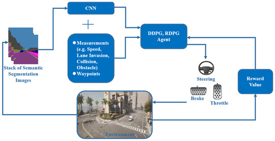 This paper proposes a hybrid framework, as shown in Figure 9. It shows a stack of semantic segmentation images as input to a Convolutional Neural Network (CNN). In addition to the CNN, various measurements such as speed, lane invasion, collision, obstacles and waypoints are also input to a combined module. Such a module is then connected to a DDPG (Deep Deterministic Policy Gradient) or RDPG (Recurrent Deterministic Policy Gradient) agent. The agent processes these inputs and decides on actions such as steering angle, brake and throttle. The output of the agent’s actions is then evaluated in the environment, resulting in a reward value that is fed back to the agent for updating future decisions. This setup illustrates a closed-loop system where the agent learns from the environment to improve its driving policy.
