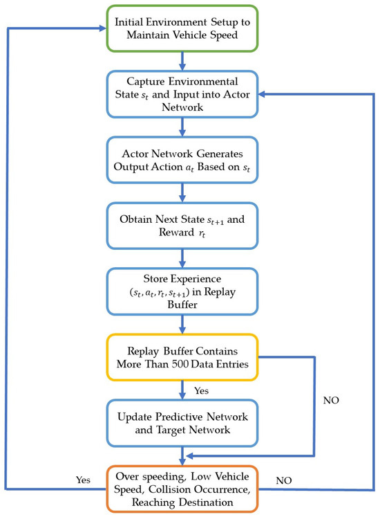 - To maintain the correct operation of the training vehicle, reset conditions are established. These include detecting unstable acceleration and deceleration behaviors of the vehicle, sensing collisions with other objects and whether the vehicle reaches the final goal. If any of these conditions are met, the training environment is reset and corresponding penalties are applied. In contrast, if the conditions are normal, the vehicle’s driving actions continue to be controlled by the Online Actor network.