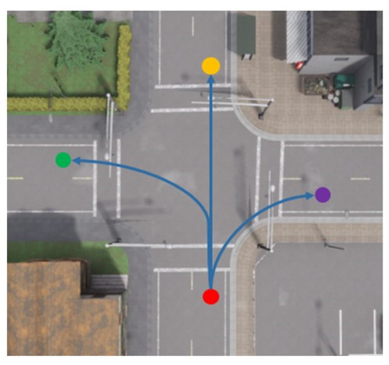 First of all, the concept of navigation with waypoints used in [35] is adopted to prevent the training car from deviating from the driving path properly arranged when it crosses the intersection. Before each behavior, a sequence of waypoints will be generated via navigation in advance, as seen in the example shown in Figure 8 for the going-straight behavior of crossing the intersection. The car will follow these waypoints to obtain a higher score and thus accomplish correct path keeping by designing an appropriate reward constituent for this objective, expressed as follows: