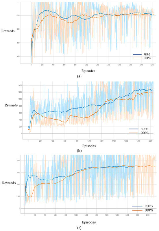 According to Figure 14, we can find that the cumulative rewards obtained from the RDPG training for the three target actions are all superior to those from the DDPG training, especially for straight movements and left turns. Specifically, after 200 episodes, the rewards obtained from RDPG gradually increased, whereas DDPG still shows significant fluctuations, and the final maximum reward value obtained is also lower than that of the RDPG method. These differences in performance can be also reflected in the loss values of the two models shown in Figure 15. Although the two algorithms consistently exhibit good performance, it can be observed that the RDPG algorithm begins to converge for right turns after about 1300 training episodes and for straight movements around 1700 episodes, while the DDPG algorithm begins to converge for right turns and straight movements during much later episodes, specifically at the 1400th and 1900th episodes, respectively. This indicates that DDPG requires a larger number of episodes to stabilize, revealing slower learning efficiency. Moreover, from the training results, we can see that the convergence speed for learning a right turn is faster compared to the other two maneuvers. This is primarily because interferences from other vehicles upon making a right turn are much fewer than those encountered during the other two maneuvers. Finally, we can conclude that since the RDPG algorithm is capable of processing time-series data, it exhibits better performance compared to the DDPG algorithm.