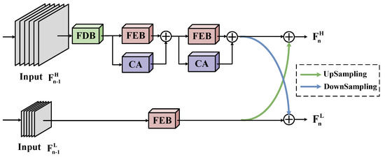 Inspired by the ultrasound image despeckling network [41], we decompose the input image in the frequency domain. As shown in Figure 2, the high-frequency component and the low-frequency component are taken as the two inputs of the denoising block, and both branches are processed simultaneously. The feature denoising block (FDB) is applied in the high-frequency branch for denoising, while the low-frequency branch only utilizes the feature extraction block (FEB) for extracting low-frequency features. Additionally, in the high-frequency branch, the combination of the FEB and channel attention (CA) through skip connections significantly improves the despeckling performance. The high-frequency component provides fine details to the low-frequency component, while the low-frequency component provides structural information to the high-frequency component. The denoising block facilitates the exchange of high-frequency and low-frequency information in the dual-branch network, achieving the goal of removing speckles while preserving the details.